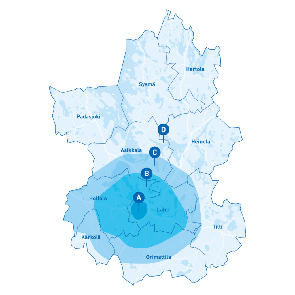 C = Orimattilan keskustaajama, Hämeenkoski, Vääksy ja Vesivehmaa (Asikkala), Vierumäki (Heinola), Kärkölä